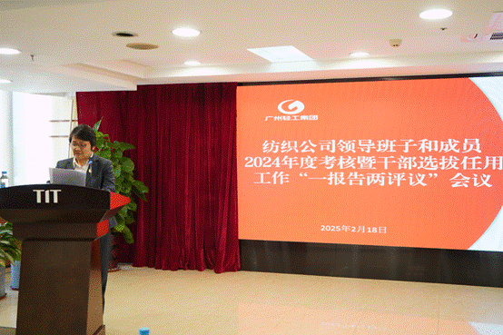 2月18日下午,紡織公司黨委召開領(lǐng)導(dǎo)班子和成員2024年度述職暨干部選拔任用工作“一報(bào)告兩評(píng)議”會(huì)議。會(huì)議由公司黨委副書記、工會(huì)主席丘海瀾主持。紡織公司領(lǐng)導(dǎo)班子成員、中層管理干部、公司“一代表兩委員”以及黨員干部群眾代表參加了會(huì)議,廣州輕工集團(tuán)紀(jì)檢監(jiān)察室派員出席了會(huì)議。