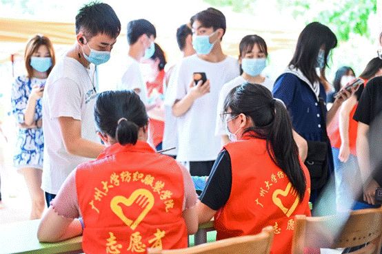 此次到現場為師生開展核酸檢測的12名醫護人員均來自暨南大學附屬第一醫院廣州華僑醫院。為了在最短時間內阻斷病毒傳播途徑、切斷感染鏈條,醫護人員堅守在核酸采集一線,一絲不茍地為每個受監測者采樣。他們在近期已是第五次接受“召集令”,馬不停蹄出戰支援學院開展核酸檢測工作。炎熱的天氣,加上厚重的防護服,汗水很快就浸濕了衣服,但他們不言苦累,一直奮戰到核酸檢測工作結束。