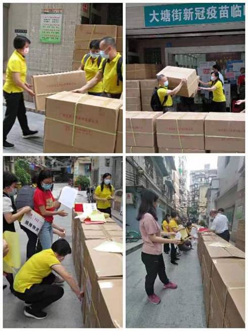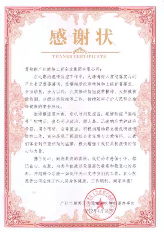 當前,廣州疫情趨緊,4月12日,紡織公司黨委書記、董事長簡瑋儀,黨委副書記、紀委書記、工會主席丘海瀾親自帶隊,把1500盒利工民毛巾送到了越秀區大塘街道。